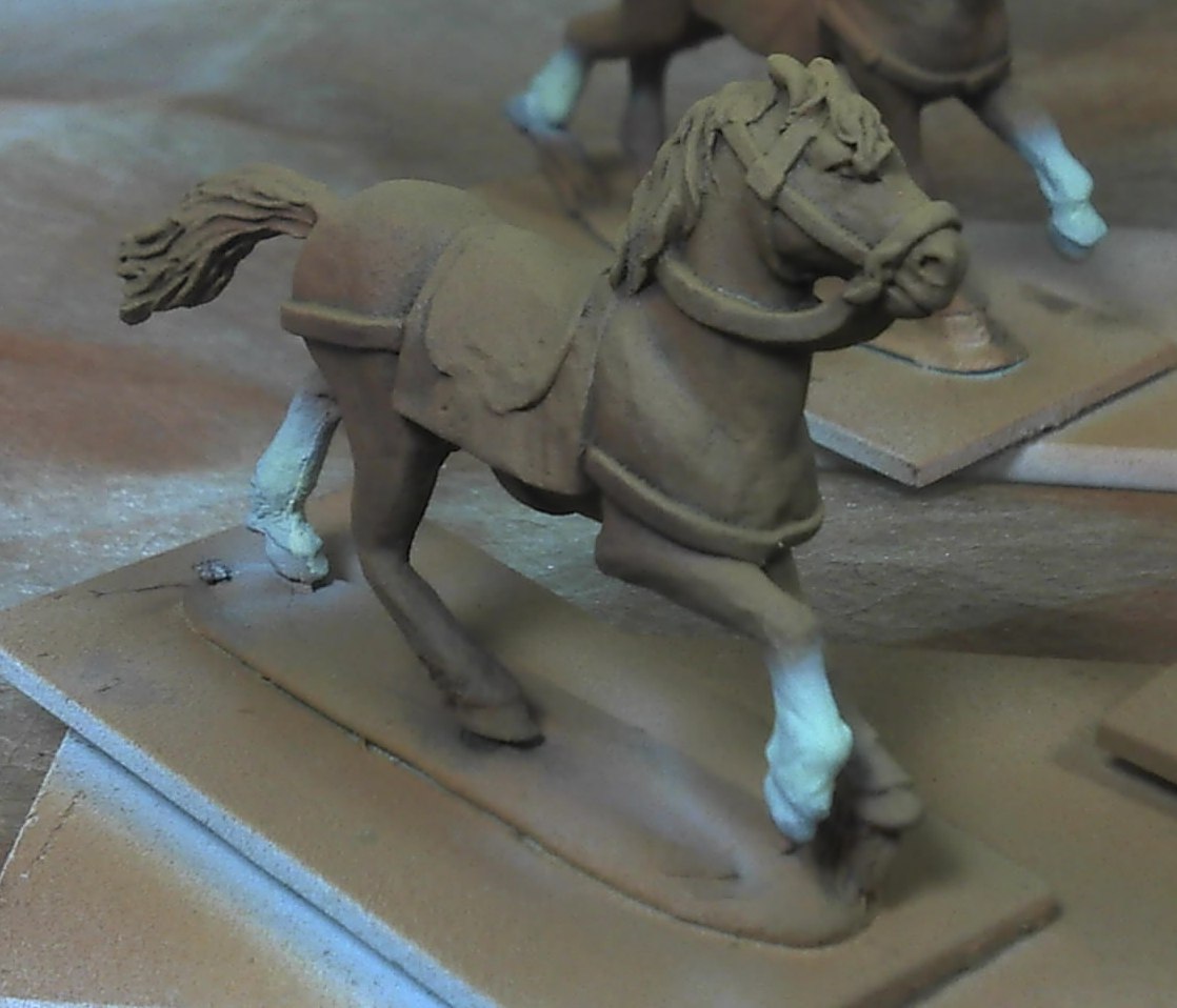 Well, after spending a whole weekend learning to use the airbrush, I figured I better put it to good use. So out came the horses for the three points of SAGA Hearthguard and the warlord, 13 horses. They were mounted up and primed white (and quite frankly, despite my grey primer leanings, black is a better primer for the airbrush sometimes with a shot or two of white primer over the top to really make things pop). I messed up the midtone initially (bad color choice) but easily overcame that since the airbrush paint goes on so thin. Overall I'm pleased with them at this point. They are down to brush work right now. I did airbrush the socks just to see if I could do that and really didn't have much problem with that. The black manes were tougher and that really will need the paint brush to finish up. I did one blaze but I think it will be better to do the blazes with the brush. Some are better than others but I'm still learning what I can and cannot do and what will work best with different things. I worked with Vallejo Model Air, Vallejo Panzer Aces, Flames of War (which I believe is just Vallejo Game Color re-packaged) and Reaper HD paints.