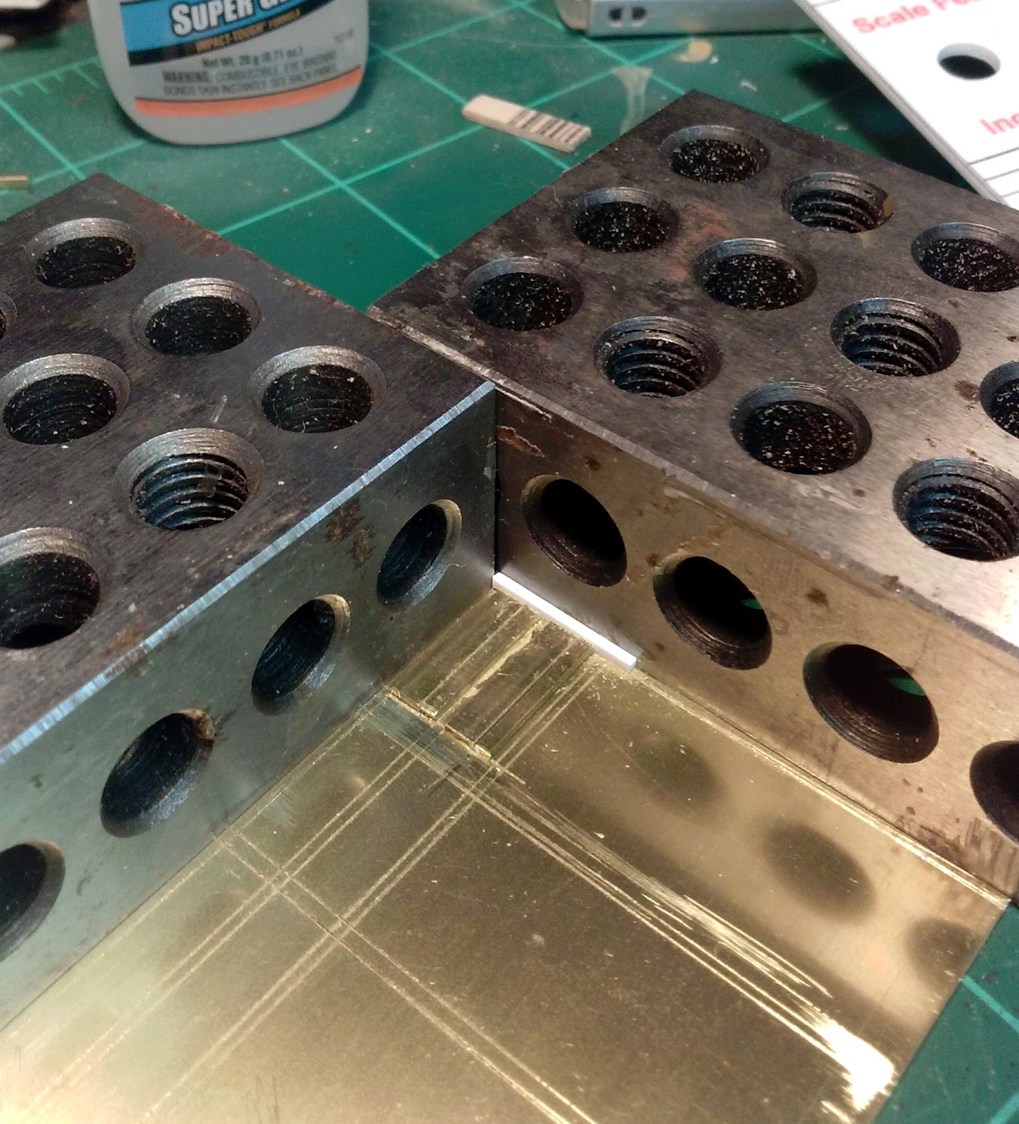 | Hard to see, but all the parts are glued on to the brass sheet and I succeeded in making a nice square joint |